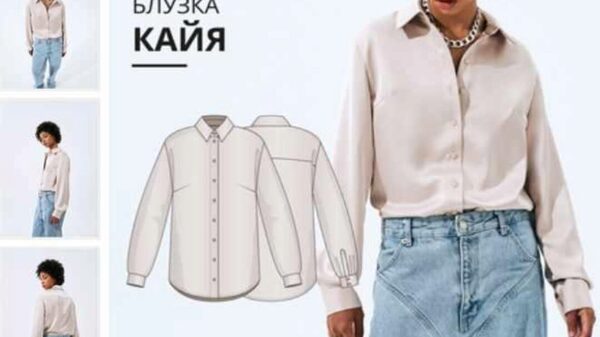 Выкройка блузки большого объема, прямого силуэта. На детали спинки расположена двойная кокетка, переходящая на деталь полочки. Под кокеткой на спинке расположена встречная складка. Воротник рубашечный отложной на стойке. Застежка планка центральная на прорезные петли и пуговицы. Линия плеча