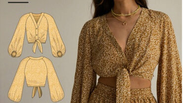Выкройка укороченной блузки малого объема. Посередине переда разрез, обработанный кулисками, в которые вставлены завязки, формирующие сборку. По низу переда кулиска с резинкой. Деталь спинки разъемная. Детали спинки соединяются с помощью длинных завязок, формирующих бант. По переду и спинке
