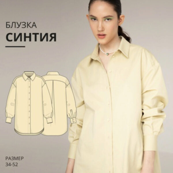 Выкройка блузки большого объема, прямого силуэта. На детали спинки расположена двойная кокетка, переходящая на деталь полочки. Под кокеткой на спинке расположена бантовая складка. Воротник рубашечный отложной на стойке. Застежка планка центральная на прорезные петли и пуговицы. Линия плеча