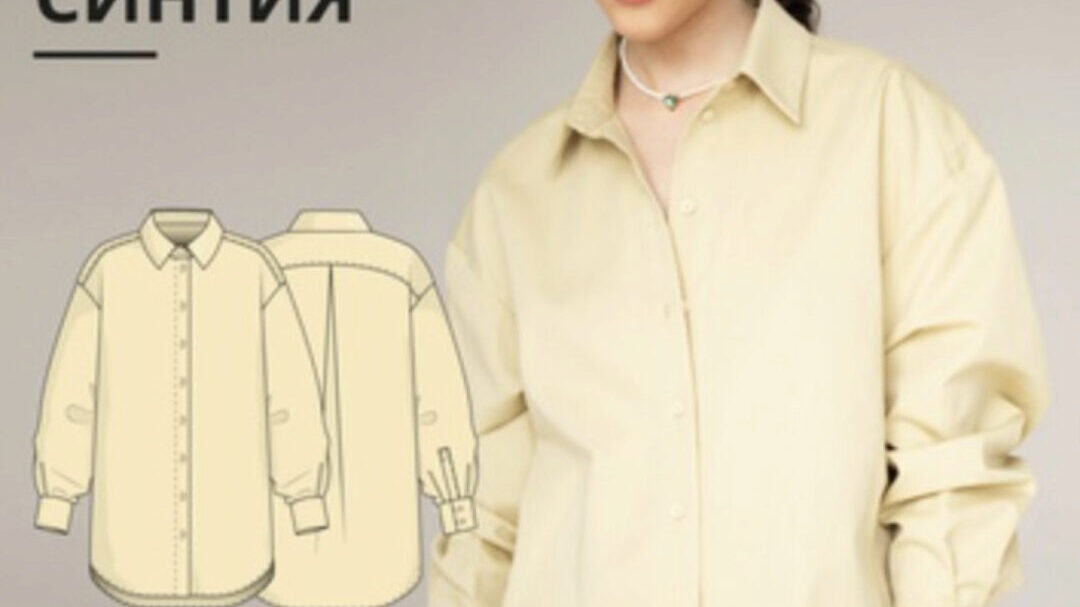 Выкройка блузки большого объема, прямого силуэта. На детали спинки расположена двойная кокетка, переходящая на деталь полочки. Под кокеткой на спинке расположена встречная складка. Воротник рубашечный отложной на стойке. Застежка планка центральная на прорезные петли и пуговицы. Линия плеча