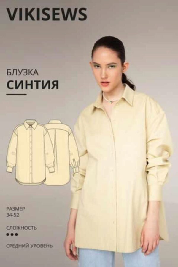 Выкройка блузки большого объема, прямого силуэта. На детали спинки расположена двойная кокетка, переходящая на деталь полочки. Под кокеткой на спинке расположена встречная складка. Воротник рубашечный отложной на стойке. Застежка планка центральная на прорезные петли и пуговицы. Линия плеча