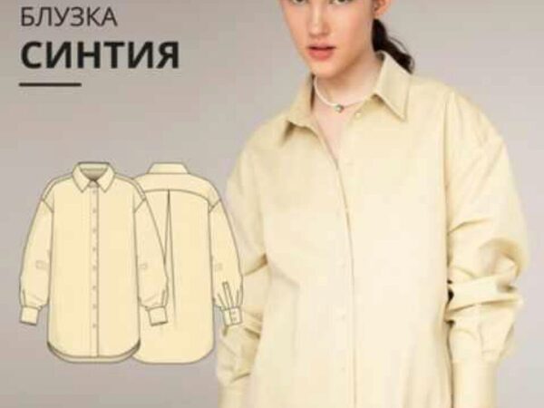 Выкройка блузки большого объема, прямого силуэта. На детали спинки расположена двойная кокетка, переходящая на деталь полочки. Под кокеткой на спинке расположена бантовая складка. Воротник рубашечный отложной на стойке. Застежка планка центральная на прорезные петли и пуговицы. Линия плеча
