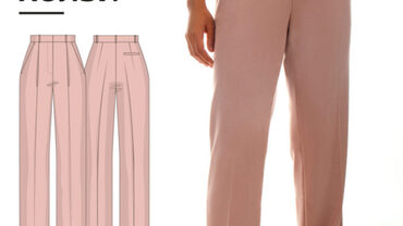 Выкройка брюк умеренного объема, прямого силуэта, с заутюженными стрелками. На задних половинках талиевые вытачки. На правой задней половинке прорезной карман с листочкой. На передних половинках, на уровне талии, заложены складки, направленные в сторону боковых швов. На передних половинках брюк