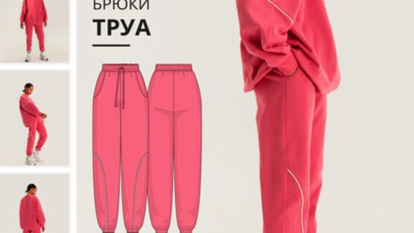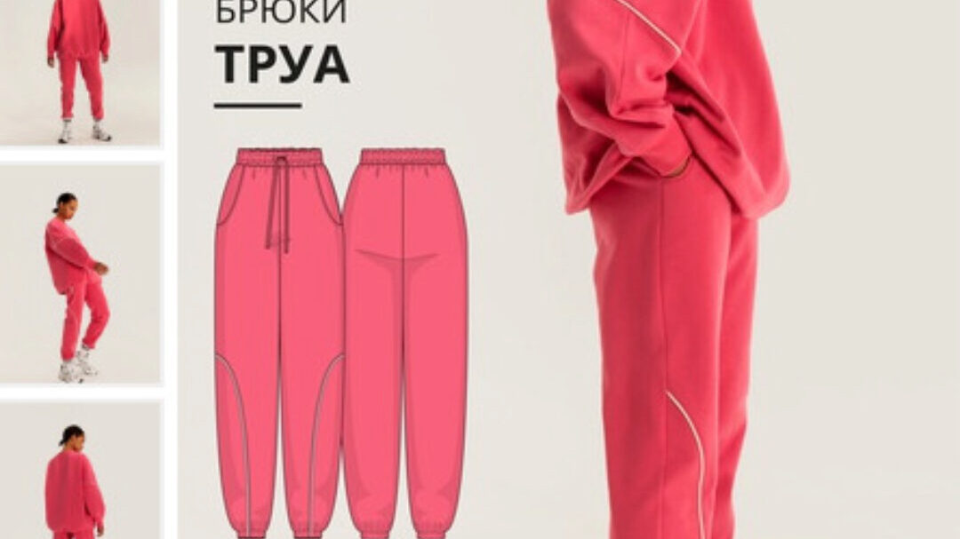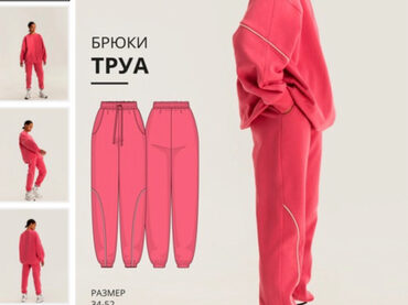 Выкройка брюк прямого силуэта, большого объема. В боковых швах функциональные карманы. Пояс широкий притачной, с эластичной тесьмой внутри. Тесьма закреплена в поясе двумя строчками. Верхний край пояса расположен на естественной линии талии. Длина брюк ниже уровня щиколоток. Примерное время пошива