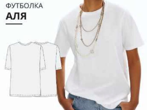 Выкройка базовой женской футболки умеренного объема, прямого силуэта. Округлый вырез горловины. Втачные рукава. Длина футболки до середины бедер. Для пошива футболки подойдет трикотажное полотно, которое должно обладать следующими свойствами: - мягкостью, средней плотностью, умеренной