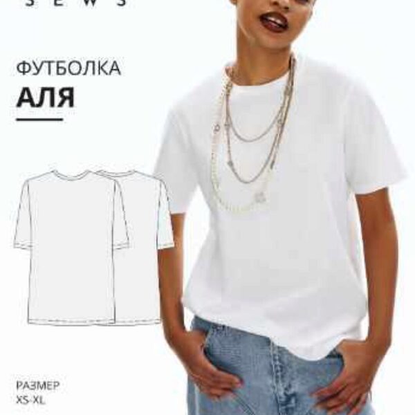 Выкройка базовой женской футболки умеренного объема, прямого силуэта. Округлый вырез горловины. Втачные рукава. Длина футболки до середины бедер. Для пошива футболки подойдет трикотажное полотно, которое должно обладать следующими свойствами: - мягкостью, средней плотностью, умеренной