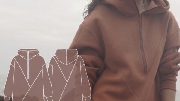 Выкройка худи большого объема, прямого силуэта, с капюшоном, оверсайз. Деталь переда имеет вертикальные подрезы, в которых обработаны внутренние карманы. Линия плеч спущенная. Рукав рубашечного покроя, содержит два декоративных шва, по низу рукава притачная манжета. Капюшон объемный, со швом, по
