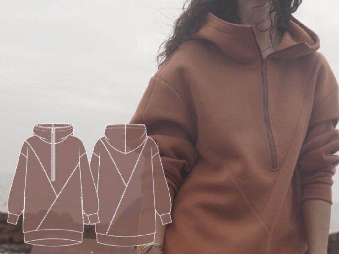 Выкройка худи большого объема, прямого силуэта. На детали переда вертикальные вставки. На детали спинки кокетка и фигурная вставка. Вставки могут быть выполнены как из кашкорсе, так из основного материала. Воротник-стойка, переходящий в капюшон. Застежка стойки на молнию до уровня груди. Капюшон
