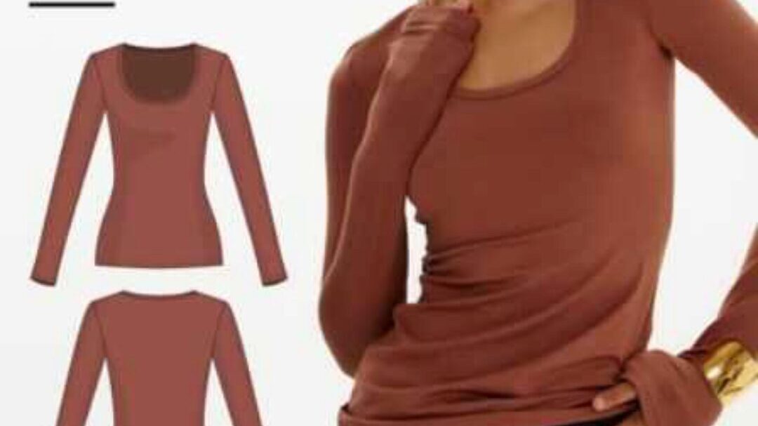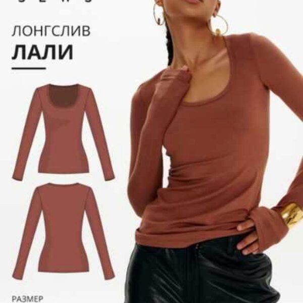 Выкройка лонгслива малого объема, прилегающего силуэта. Перед изделия состоит из двух частей. Между верхней и нижней частью переда фигурный вырез выше уровня груди. Рукав длинный (намеренно удлиненный), втачной. Горловина округлой формы, обработанная бейкой с открытым срезом. Длина изделия до линии