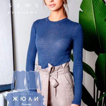 Выкройка лонгслива малого объема, прилегающего силуэта. Горловина глубокая, формы округлое каре, окантована бейкой с открытым срезом. Рукав втачной, длинный. Длина изделия ниже линии бедер. Примерное время пошива – 2 часа