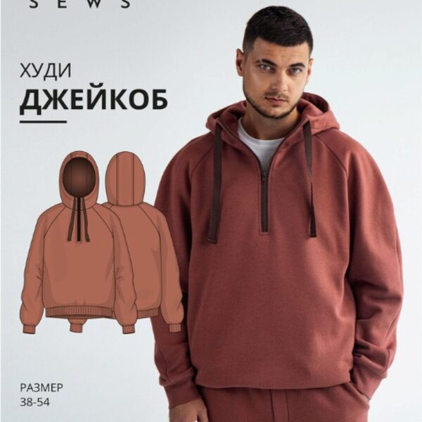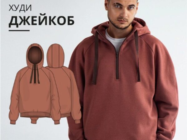 Курс vikisews - Мужские выкройки. Худи Джейкоб. Размер 38-54. Рост 170-176, автор Вика Ракуса. Выкройка мужского худи умеренного объема, прямого силуэта. Воротник-стойка, переходящий в капюшон. Капюшон двойной с кулиской, в которую продета киперная лента. Застежка стойки на молнию, которая переходит на деталь переда, до уровня линии груди. В боковых швах обработаны внутренние карманы. Рукав длинный, покроя реглан. По низу рукава притачная манжета. По низу изделия притачной пояс. Длина изделия выше линии бедер.