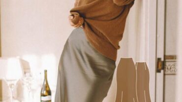 Выкройка юбки малого объема, легкого трапециевидного силуэта. Силуэт юбки образуется за счет косого кроя. На притачном поясе-резинке. В юбке использована люксовая обработка без использования оверлока: французским и московским швами. Длина изделия выше щиколотки.