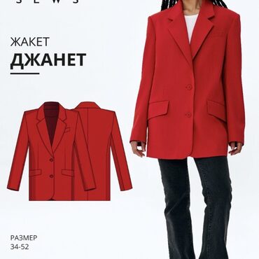 Выкройка жакета большого объема, прямого силуэта, на подкладке. Линия плеч расширена, поддерживается высокими плечевыми накладками. Спинка со средним швом и шлицей. На полочках прорезные карманы с клапаном, карманы с листочкой с настрочными концами. На правой полочке выше линии талии карман с
