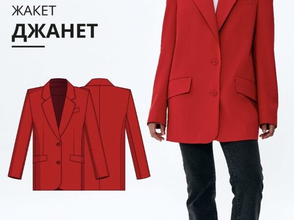 Выкройка жакета большого объема, прямого силуэта, на притачной подкладке. Спинка со средним швом. На полочке нагрудная вытачка переведена в прорезной карман с клапаном и листочкой. На левой полочке нагрудный карман с листочкой с настрочными концами. Линия плеч расширена. Рукава втачные, длинные,