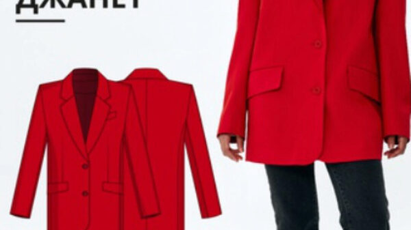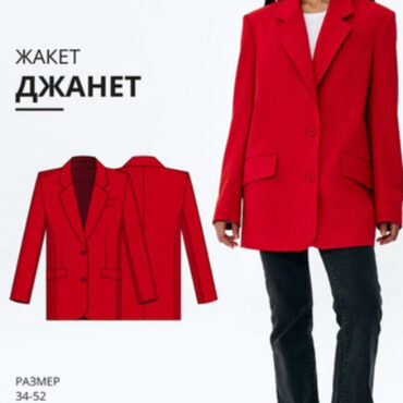 Выкройка жакета большого объема, прямого силуэта, на притачной подкладке. Спинка со средним швом. На полочке нагрудная вытачка переведена в прорезной карман с клапаном и листочкой. На левой полочке нагрудный карман с листочкой с настрочными концами. Линия плеч расширена. Рукава втачные, длинные,