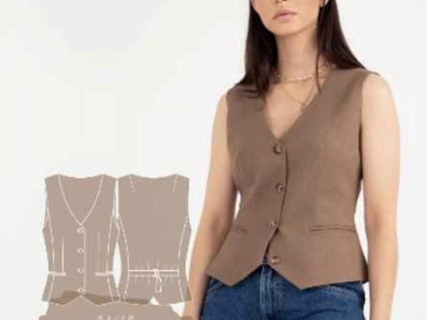 Выкройка жилета умеренного объема прилегающего силуэта. На полочках нагрудные вытачки переведены в рельефы и линию кармана. Карманы прорезные в рамку. На спинке плечевые вытачки и рельефы. В рельефах, на уровне талии два хлястика с застежкой на полукольца. По низу детали спинки фигурный вырез.