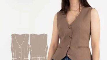 Выкройка жилета умеренного объема прилегающего силуэта. На полочках нагрудные вытачки переведены в рельефы и линию кармана. Карманы прорезные в рамку. На спинке плечевые вытачки и рельефы. В рельефах, на уровне талии два хлястика с застежкой на полукольца. По низу детали спинки фигурный вырез.