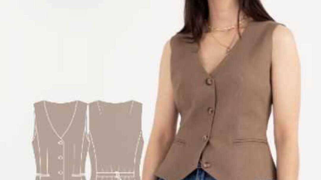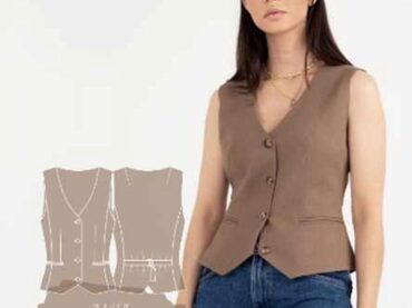 Выкройка жилета малого объема прилегающего силуэта. На полочках имитация прорезных карманов с листочкой с втачными концами. Нагрудные вытачки переведены в рельефы. Жилет на притачной подкладке. Спинка, открытая с рельефами, на уровне талии два хлястика с рамками. Вырез горловины глубокий,