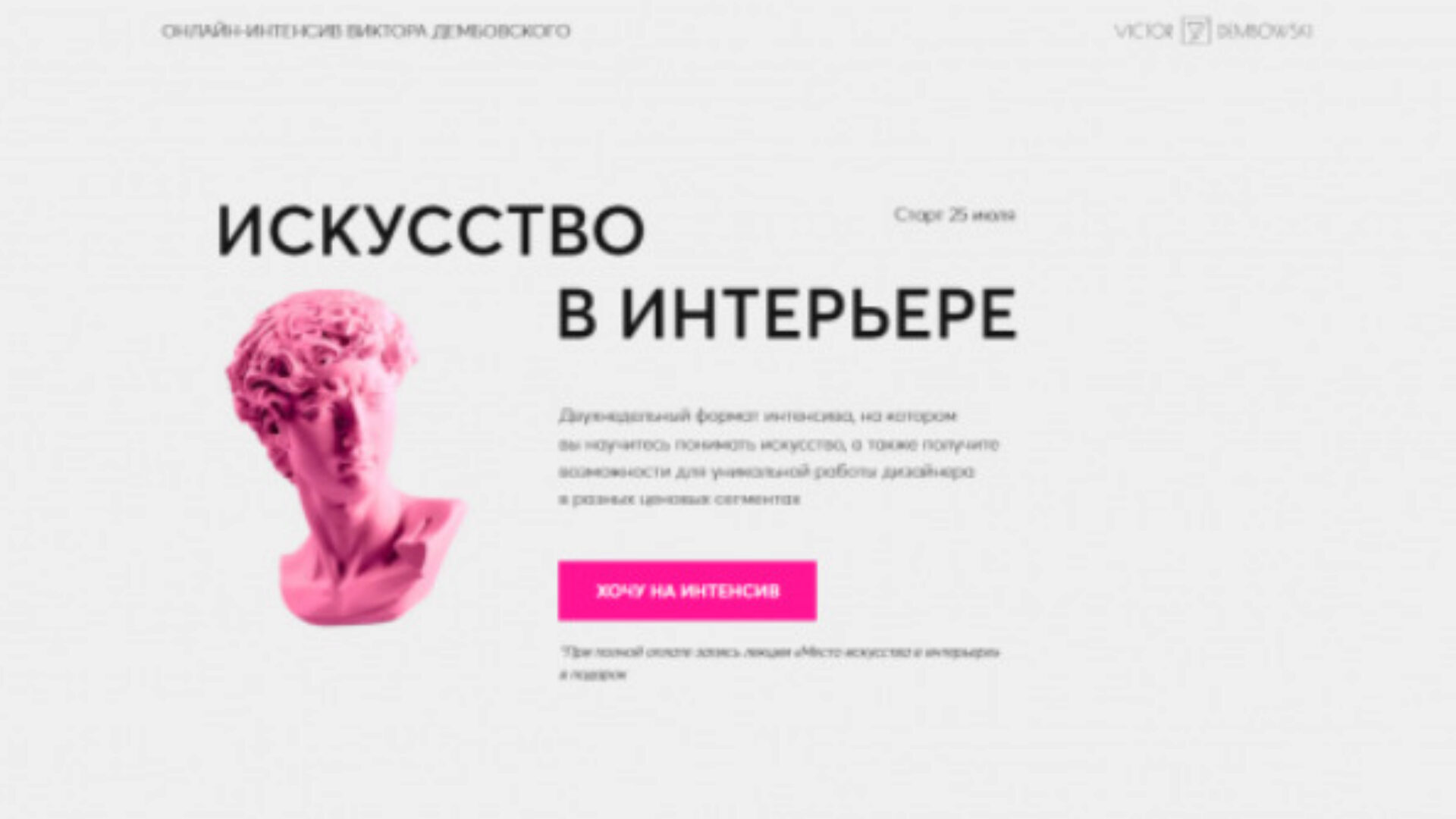 Курс Искусство в интерьере. Летний практикум, автор Виктор Дембовский. Двухнедельный формат интенсива, на котором вы научитесь понимать искусство, а также получите возможности для уникальной работы дизайнера в разных ценовых сегментах.
