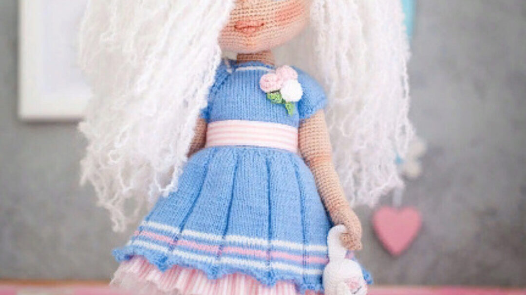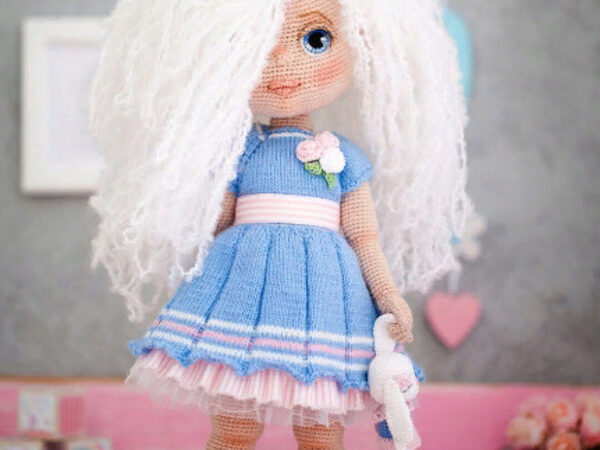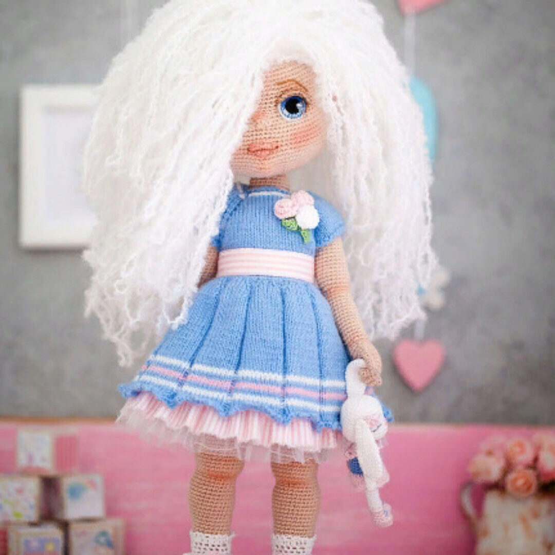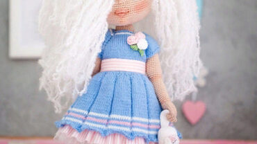 Мастер-класс в формате PDF по вязанию куклы. Мастер-класс не содержит уроков вязания и предполагает наличие навыков вязания спицами и крючком. У Мишель пышные белоснежные локоны, которые эффектно подчеркивают ее светло-карие глаза. Нарядный комбинезон выполнен в бело-голубых цветах и украшен ярким
