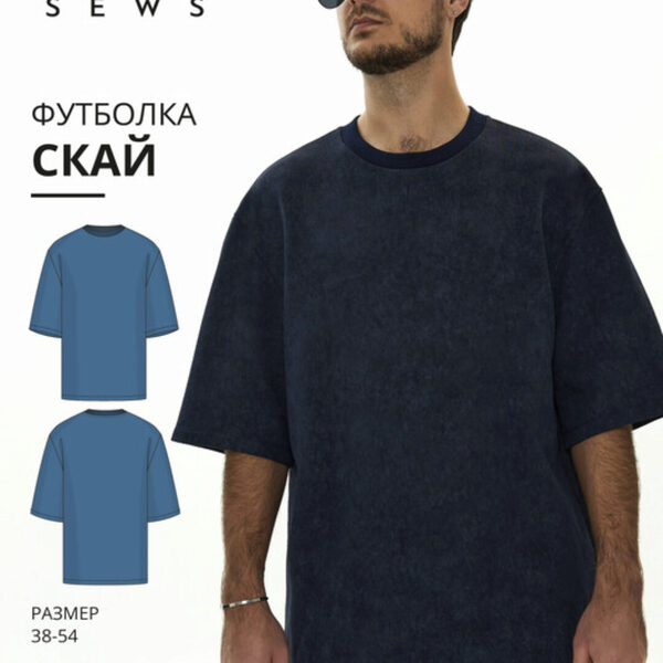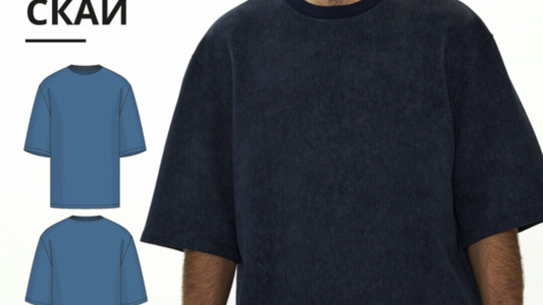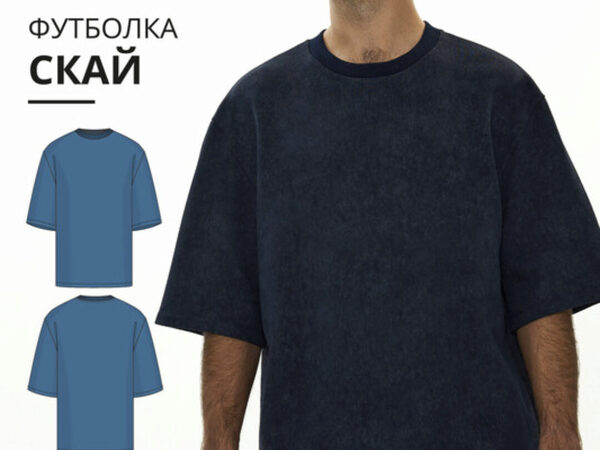 Выкройка мужской футболки большого объема, прямого силуэта. Линия плеча расширена, вырез горловины круглый, обработан бейкой. Рукав втачной, длиной до локтя. Длина футболки ниже линии бедер.