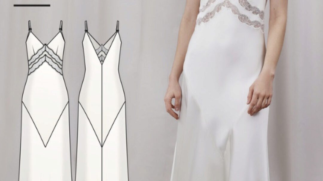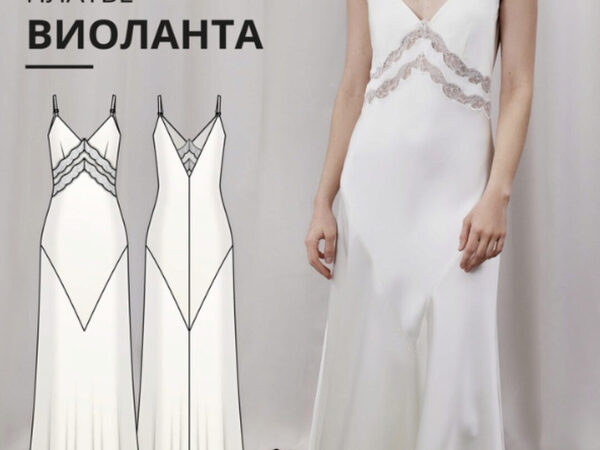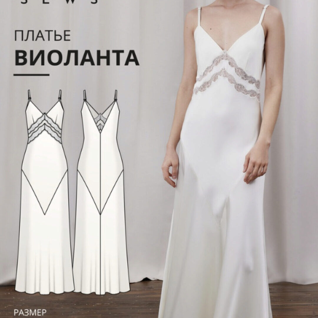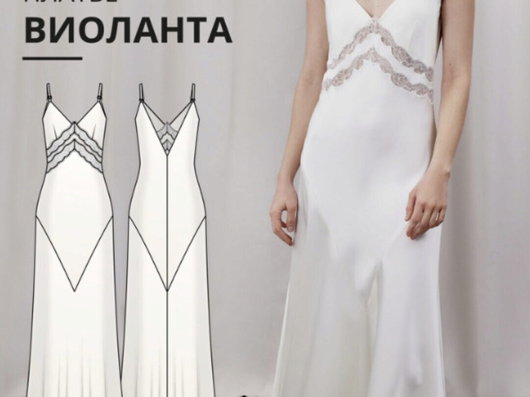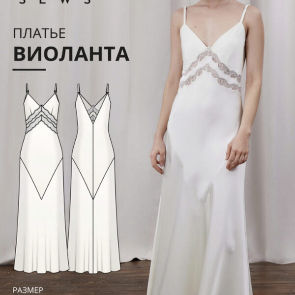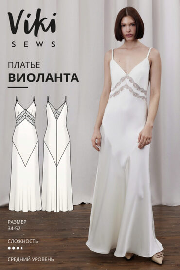 Курс Vikisews - Платье Виоланта. Размер 34-52. Рост 162-168, автор Виктория Ракуса. Выкройка платья-комбинации малого объема, прилегающего силуэта. Силуэт создан за счет косого кроя и среднего шва спинки. На детали переда нагрудные вытачки. Платье с обтачным лифом по переду и обтачкой по спинке. У изделия регулируемые бретели. На детали переда фигурные кружевные вставки, от линии бедер V-образный подрез. На детали спинки фигурная кокетка с глубоким V-образным вырезом, от линии бедер V-образный подрез. Длина платья до щиколотки.