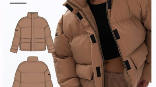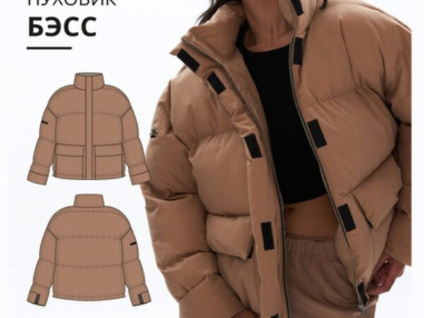 На полочках накладные карманы с клапанами на ленте велкро. Линия плеча расширена. Рукава втачные, большого объема. В верхней части правого рукава прорезной карман с молнией. По низу рукава пата с застежкой на ленту велкро. Воротник – высокая стойка. Застежка центральная, на разъемную молнию с планкой на ленту велкро. Низ пуховика оформлен кулиской, в которую продет шнур с фиксатором. Изделие на притачной подкладке. Длина до линии бедер.