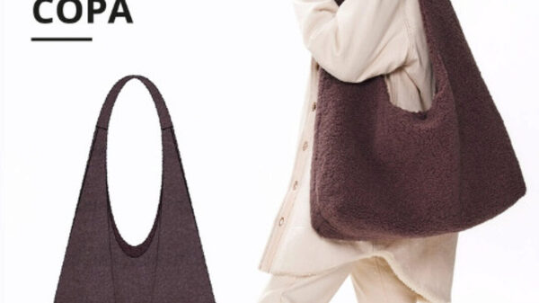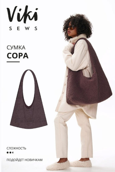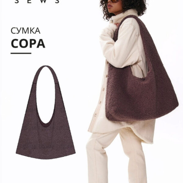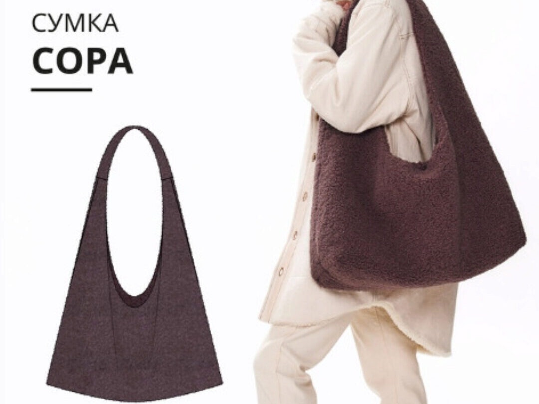 Выкройка сумки большого объема, жесткой формы из натуральной замши (велюра) на притачной подкладке. Верхний край оформлен обтачкой. На стенках сумки расположены ручки жесткой формы и съемная лямка с пряжкой. По бокам расположены хлястики с пряжкой, регулирующие ширину. На стенках подкладки