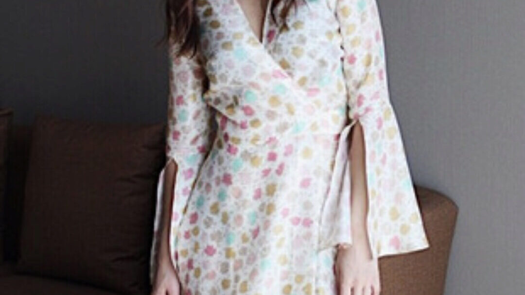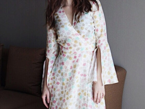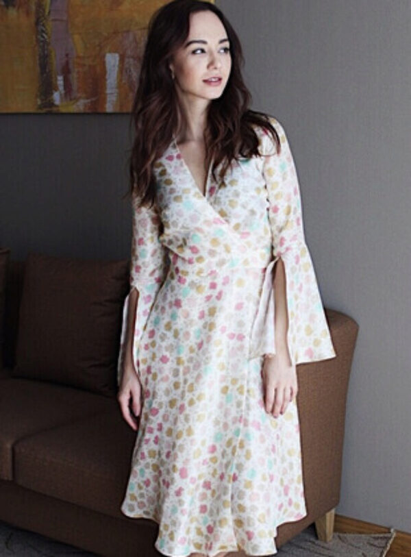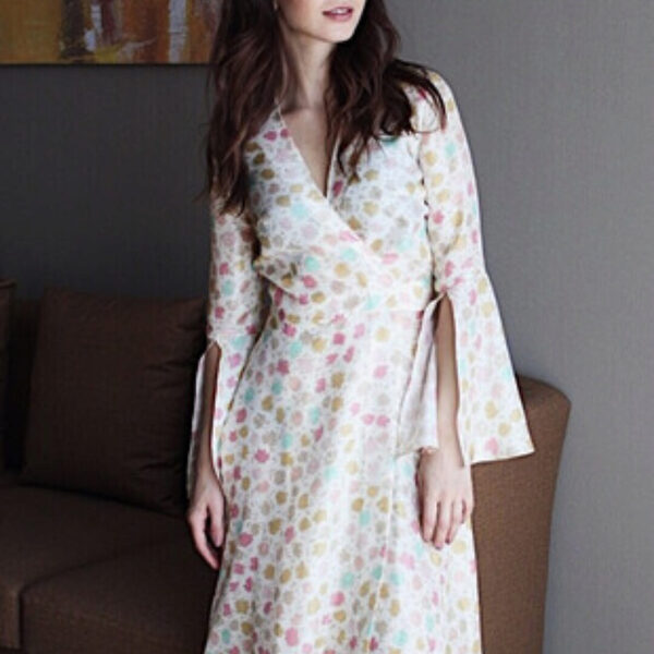 Легкое и женственное платье с функциональным запахом на поясе, расклешённой юбкой и втачными рукавами с воланами. По желанию, вы можете регулировать длину изделия и рукава, наличие/отсутствие воланов.
