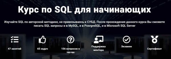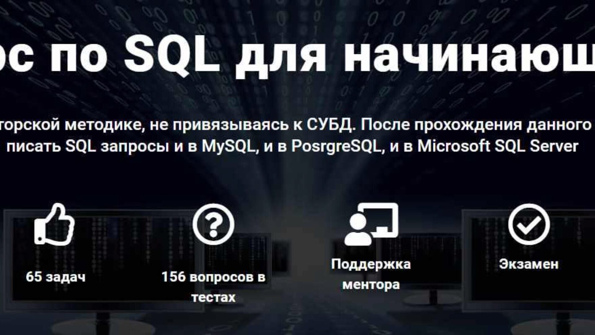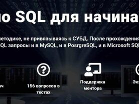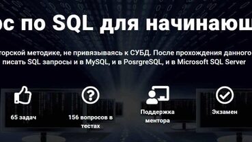 Изучайте SQL по авторской методике, не привязываясь к СУБД. После прохождения данного курса Вы сможете писать SQL запросы и в MySQL, и в PosrgreSQL, и в Microsoft SQL Server