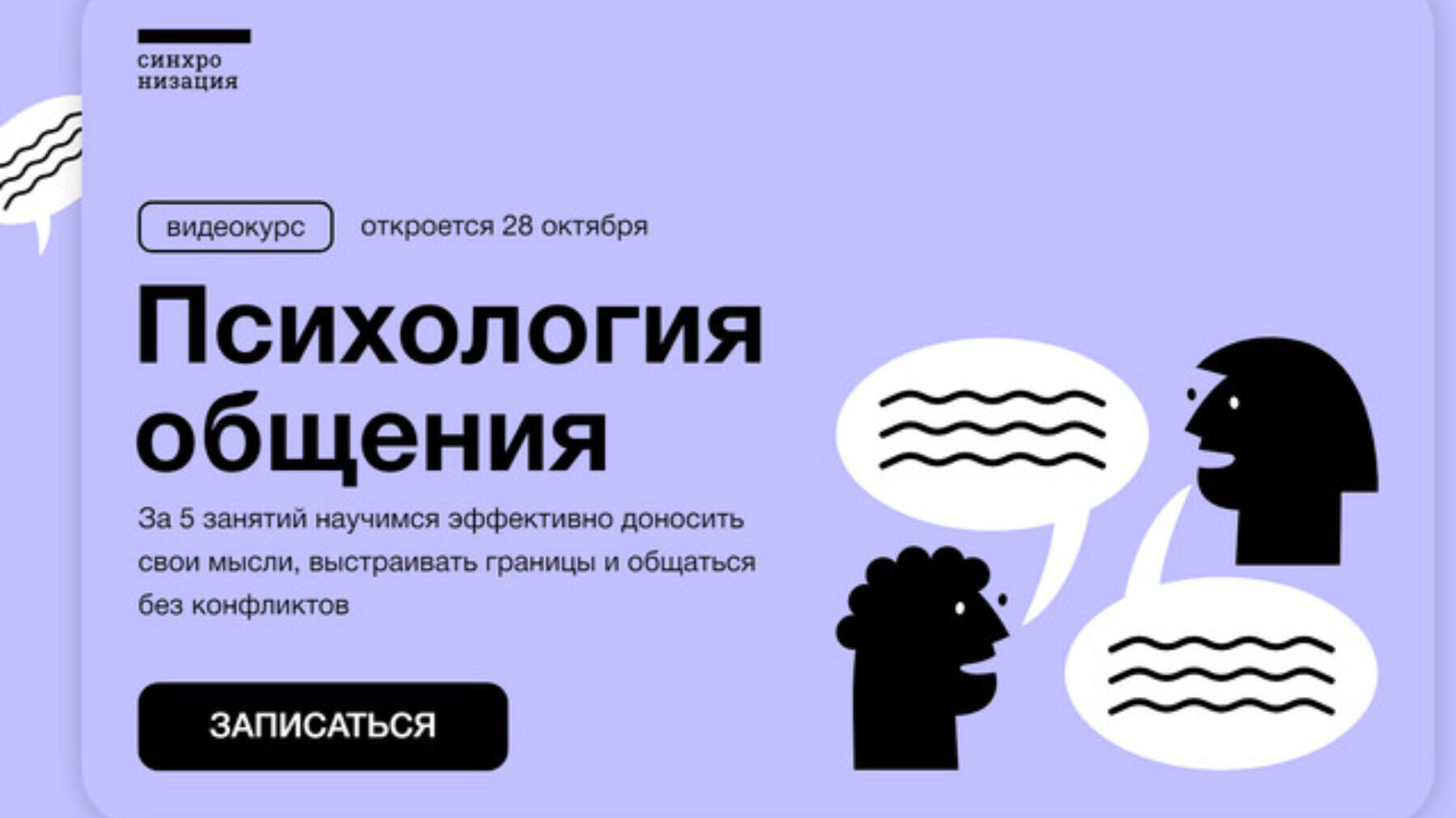 За 5 занятий научимся распознавать манипуляции и не поддаваться им, понимать, что движет собеседниками, и правильно выставлять границы. Освоим техники ненасильственного и экологичного общения. Научимся подбирать слова так, чтобы быть услышанными и достигать своих целей.