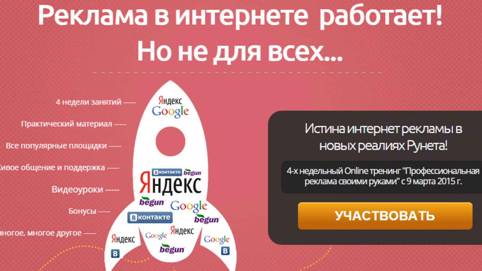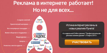 Тренинг начнется 31 марта и будет длиться 4 недели, его цель - максимальная эффективность. Мы подробно разберем рекламу, начиная с азов и заканчивая ее оптимизацией. Все это с примерами, домашними заданиями, нужными сервисами, ссылками и т.п. Вам не придется искать что-то самостоятельно, мы все сделали за вас!