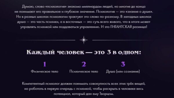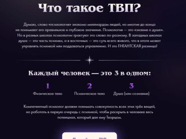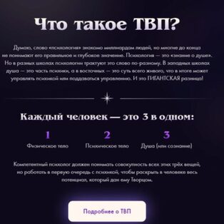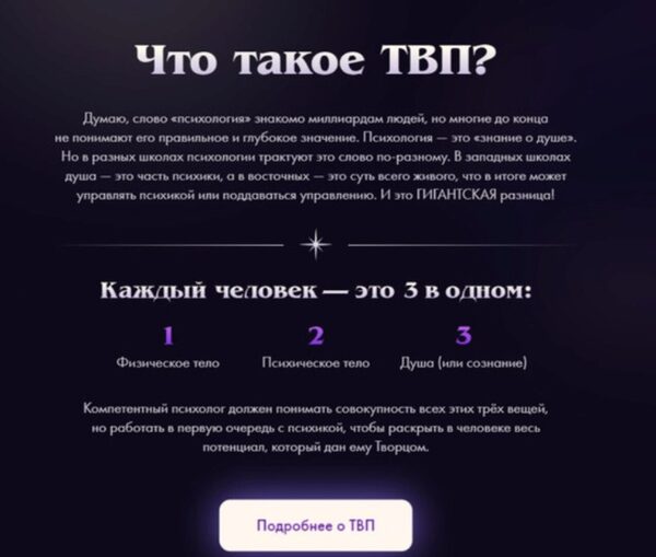 Здесь мы разберём самые интересные и эффективные, на мой взгляд, психологические течения, из которых я взял самое эффективное и внедрил в ТВП. Ты поймёшь что и почему я взял, и как это работает. Поймешь, что сэкономил свое время, получив в ТВП сразу квинтэссенцию всего моего многолетнего опыта.