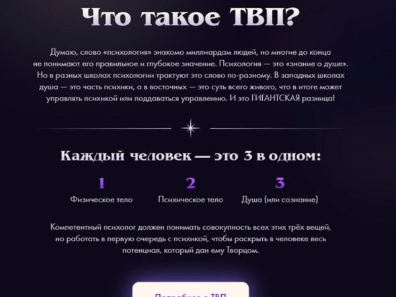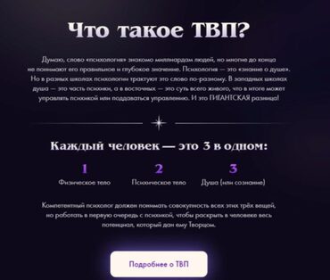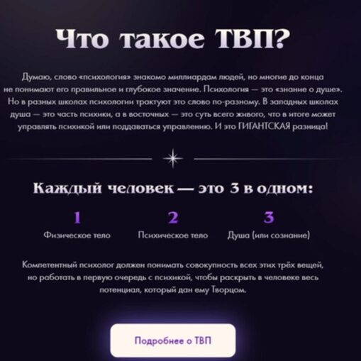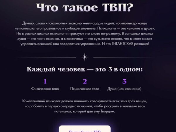 Если сказать о ТВП коротко, то это очень сильная и авторитетная философия, которая приводит к пониманию того, как реально работает психика, а также дает одни из самых эффективных инструментов по работе с психикой. И психолог, на мой взгляд, это человек, который может решать не только проблемы людей, но и решает любые свои проблемы. Это человек, который сам достигает совершенства характера и контроля над своей психикой. О себе могу сказать только одно — моя жизнь изменилась вкорне. А твоя жизнь после обучения ТВП больше не будет прежней! Добро пожаловать в команду.