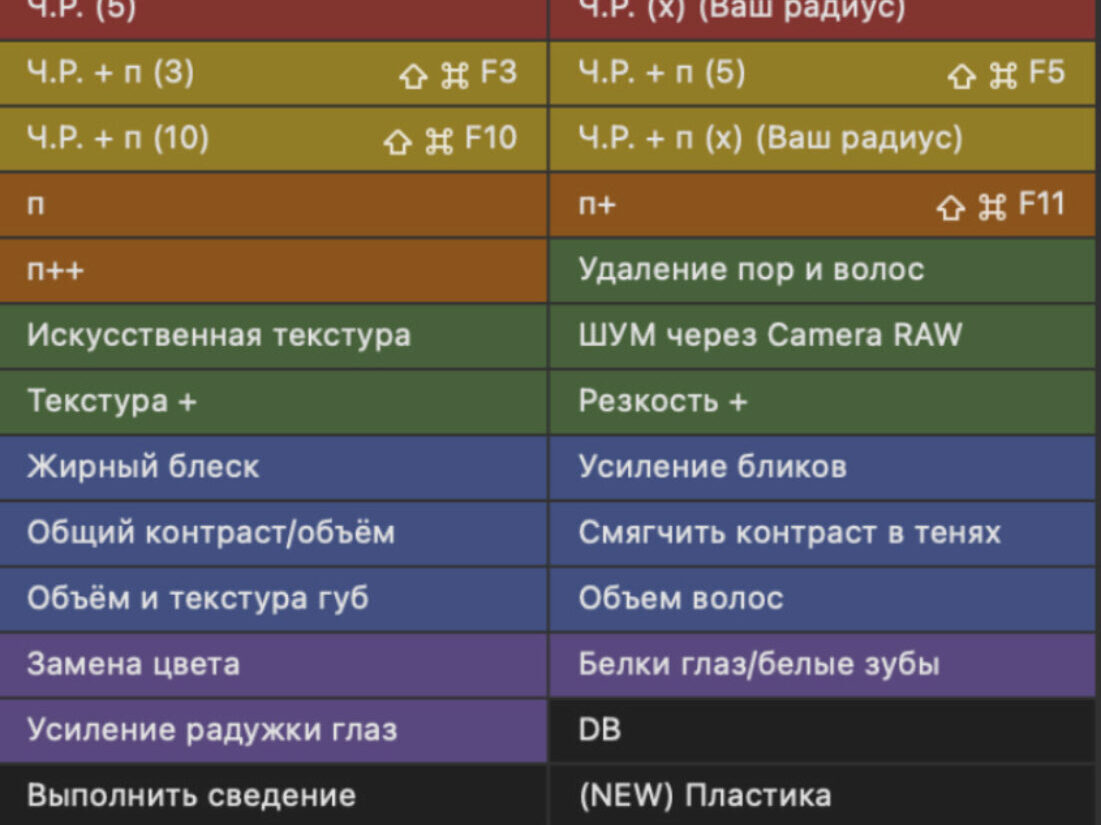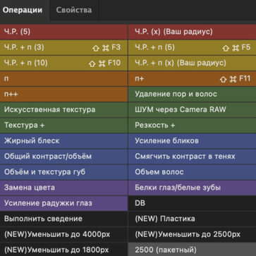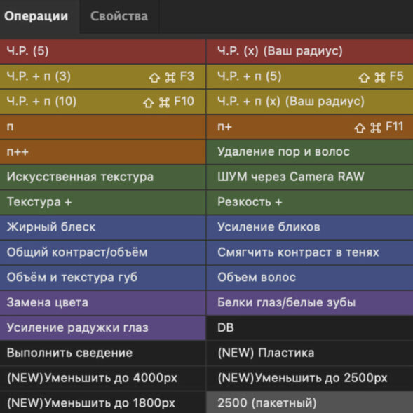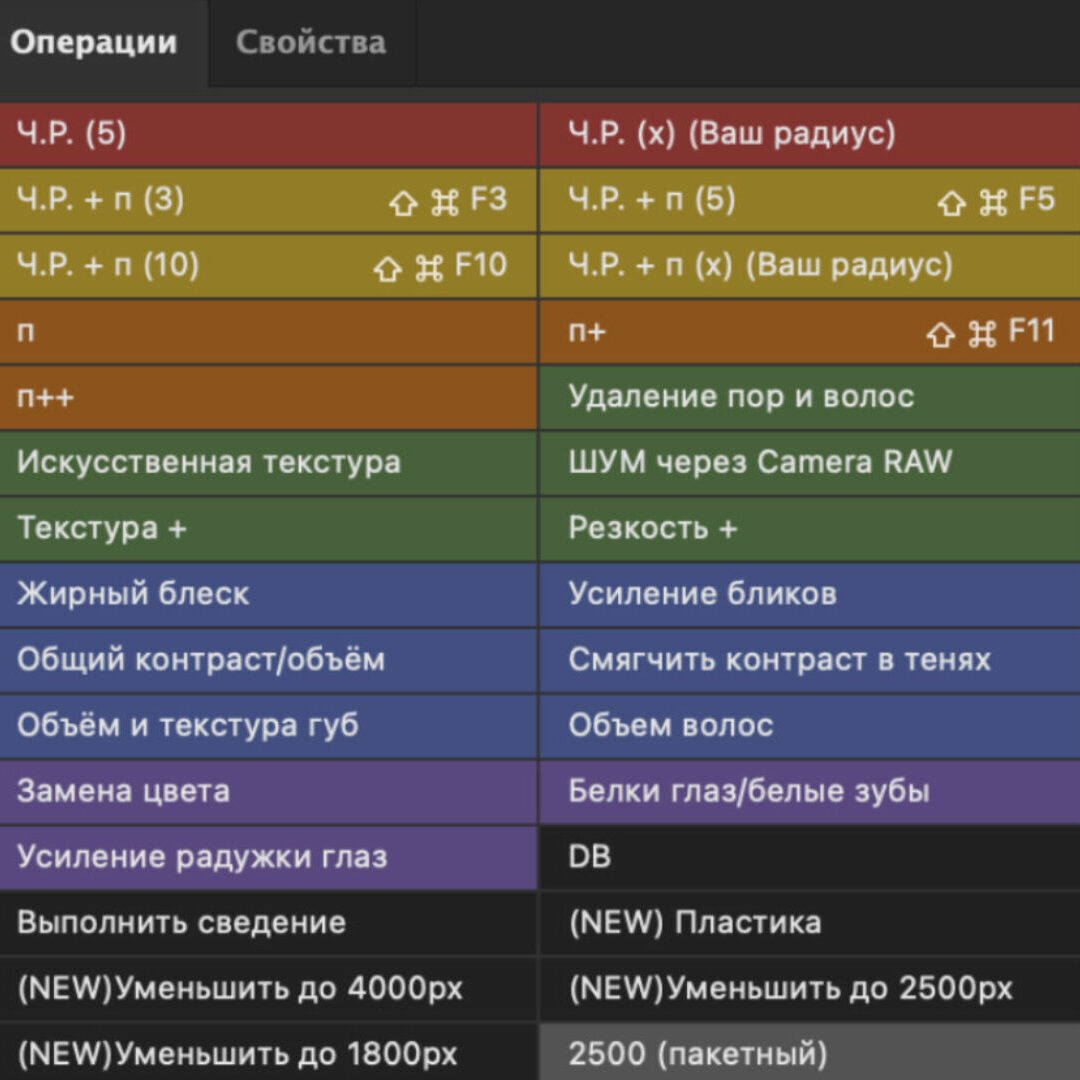 Что Вы получите? - Панель экшенов версии 2.0 - Экшены для быстрой работы с кожей - Экшены для дополнительной работы с текстурой - Экшены для работы с блеском, объёмом и светом - Экшены по работе с глазами/губами/зубами - Автоматизация сохранения для соц. сетей - Дополнительные экшены для ускорения