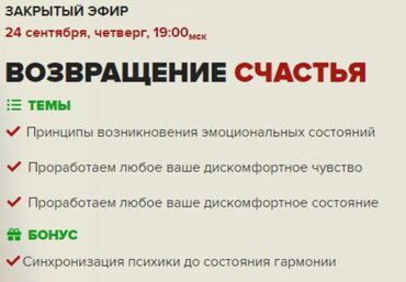 На этот раз я модифицировал Метод Макулова и создал процесс который за полчаса меняет ваше состояние на более спокойное, радостное, удовлетворенное. При желании вы потом сможете пересматривать запись эфира и возвращать его себе снова.
