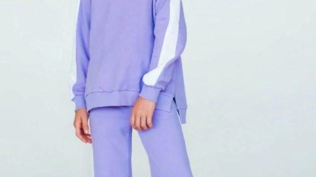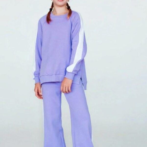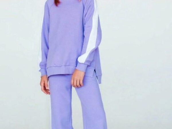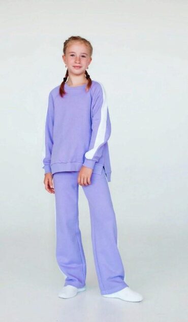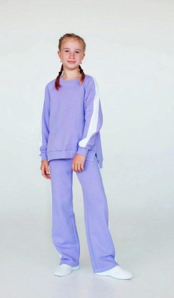 Брюки среднего объёма, прямого силуэта. На передних половинках брюк застрочены стрелки и расположены два кармана с отрезным бочком. Верхний срез обработан притачным поясом на резинке. Толстовка большого объёма, длиной чуть ниже линии талии. На полочке - горизонтальный шов, расположенный ниже линии