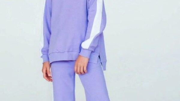 Свитшот свободного объема, прямого силуэта. Рукав покроя реглан, по центру рукава по всей длине проходит контрастная вставка (лампасы). Низ рукава обработан притачной манжетой. Спинка длиннее переда. В боковых швах разрезы. Низ свитшота обработан планками. Горловина обработана обтачкой.