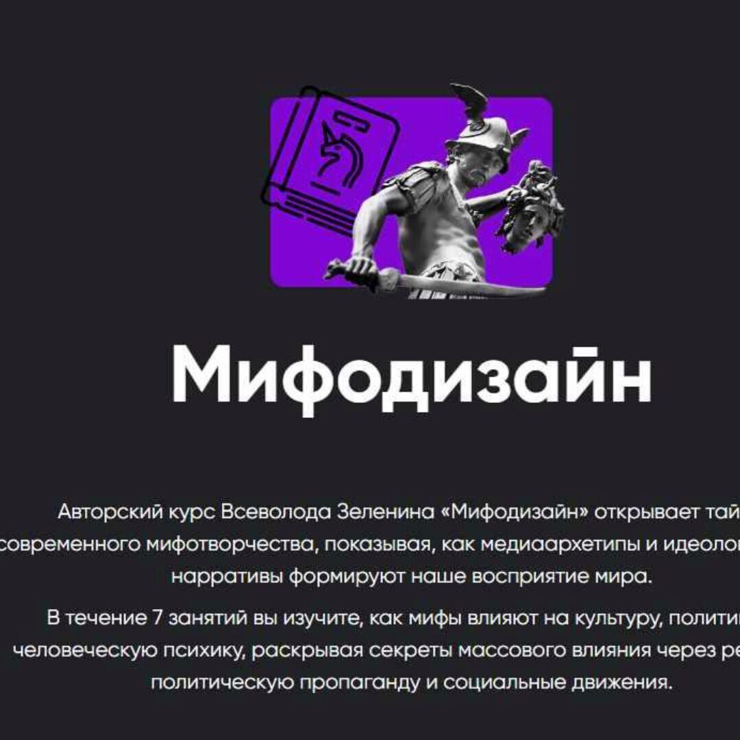 Авторский курс Всеволода Зеленина «Мифодизайн» Наш мир — арена мифодизайна, где каждая история, каждый образ, который мы воспринимаем, является звеном большой игры воображения и влияния. Управляя нами каждую минуту, незаметно и мастерски, современные мифодизайнеры — архитекторы нашего восприятия