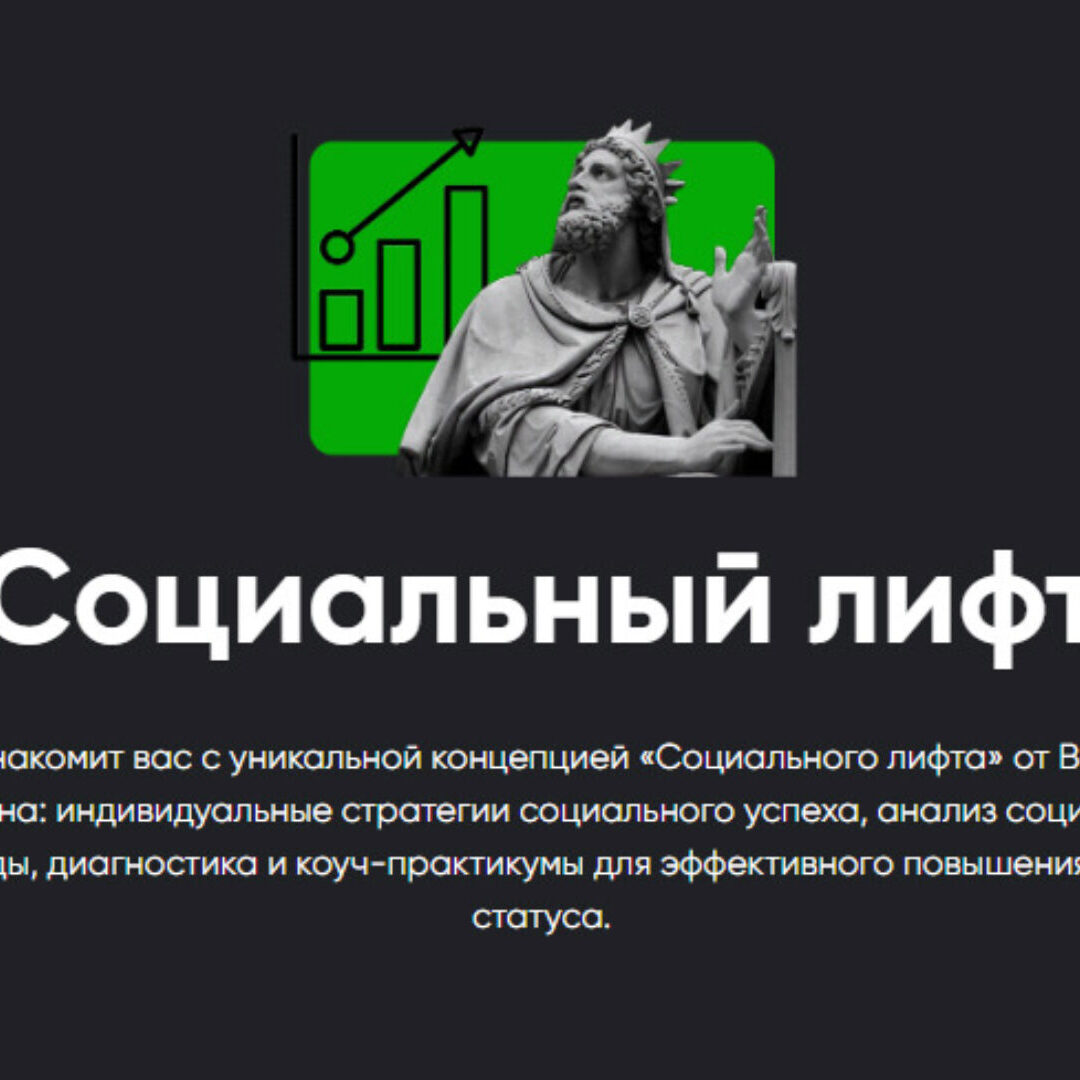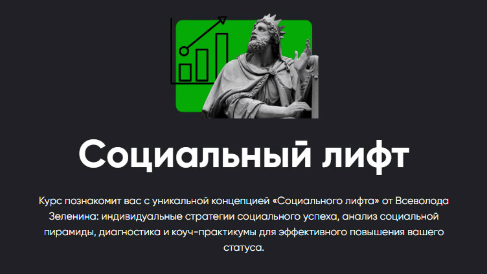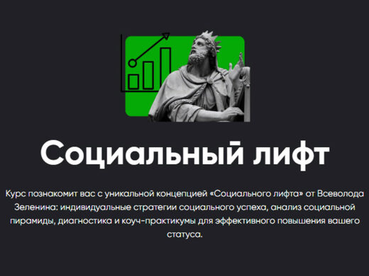 Курс познакомит вас с уникальной концепцией «Социального лифта» от Всеволода Зеленина: индивидуальные стратегии социального успеха, анализ социальной пирамиды, диагностика и коуч-практикумы для эффективного повышения вашего статуса.