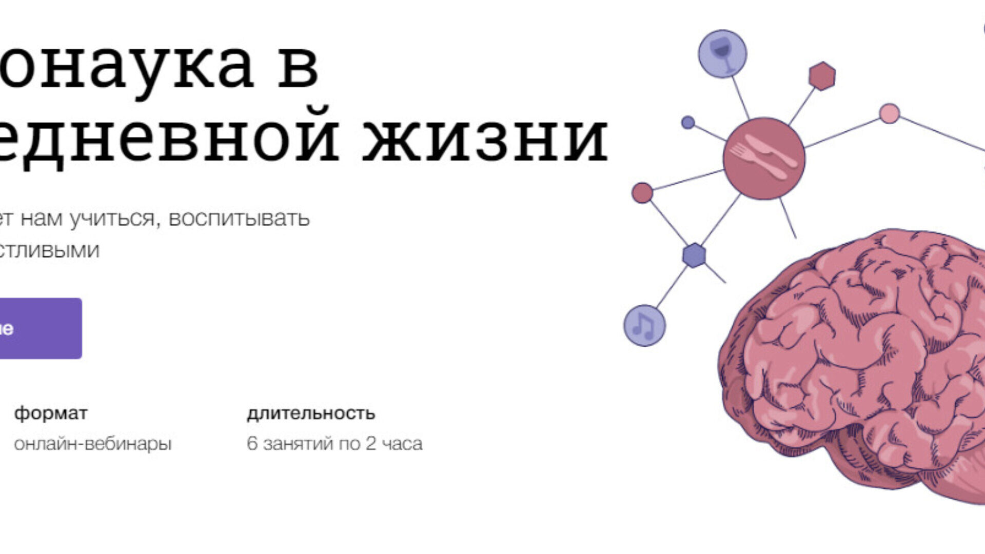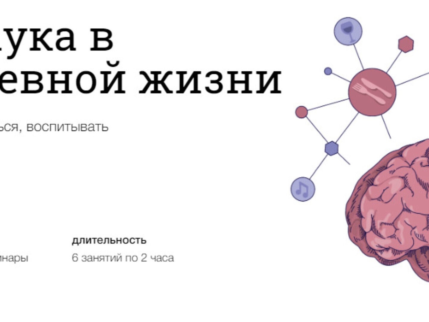 За 6 вебинаров разберёмся, как устроен наш мозг и какие его участки отвечают за запоминание информации и различные потребности. Выясним, как меняется мозг ребёнка, пока он взрослеет. Узнаем, почему искусство приносит нам радость наравне с едой и сексом и как применять эти знания в жизни.