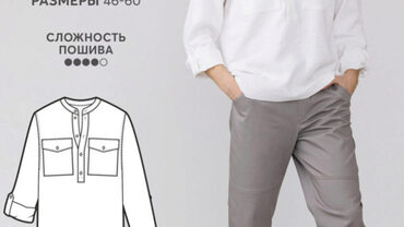 Выкройка рубашки большого объема, прямого силуэта. На полочках накладные карманы с клапаном. На спинке двойная кокетка, переходящая на полочку. Воротник на отрезной стойке. Рукав рубашечный, большого объема, длинный. Разрез рукава обработан планкой-обтачкой. По низу рукава складка и притачная
