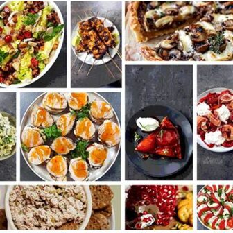 Ароматный капрезе со свежими томатами в собственном соку Закусочный пикантный сырный шар с гранатом Теплый салат-гарнир из картофеля с фисташками Закусочные сытные бутерброды с домашней печеной свининой и яблоками Праздничный тарт с грибами и сыром Печеные перцы с бураттой и прошутто. Элегантное
