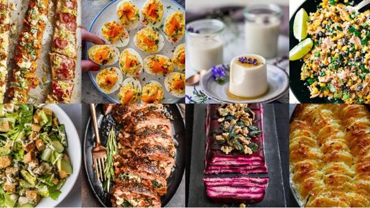 Меню: Праздничная галета с тыквой и остренькими колбасками Гарнир-салат из картофеля и стручковой фасоли в медово-горчичной заправке Капрезе с румяными баклажанами и сочными томатами Оригинальный яркий греческий салат с нутом Яйца, фаршированные зеленым пикантным муссом на основе авокадо Авторские