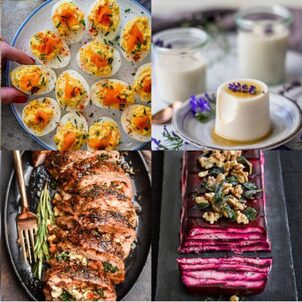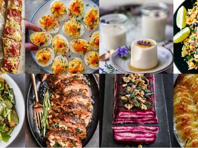 Ароматный капрезе со свежими томатами в собственном соку Закусочный пикантный сырный шар с гранатом Теплый салат-гарнир из картофеля с фисташками Закусочные сытные бутерброды с домашней печеной свининой и яблоками Праздничный тарт с грибами и сыром Печеные перцы с бураттой и прошутто. Элегантное
