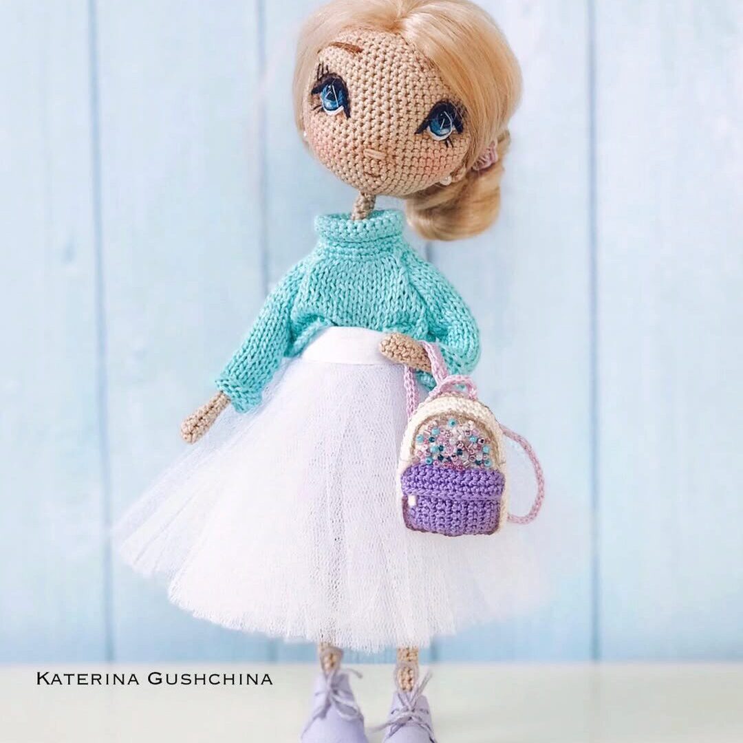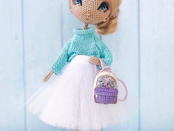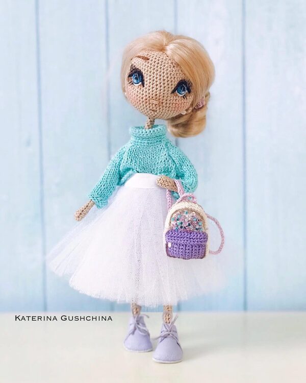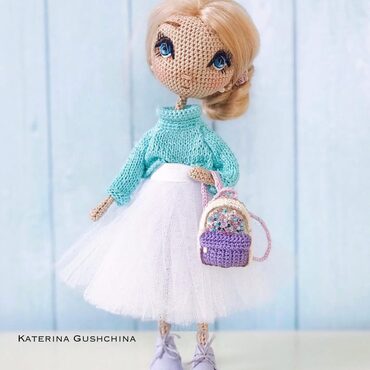 МК в формате pdf. В МК входит вязание тела (ножка фигурная), моделирование личика, прическа. Пошаговое описание наряда, вышивки, ободочка и горшка с цветами. Вставка каркаса и тонировка.