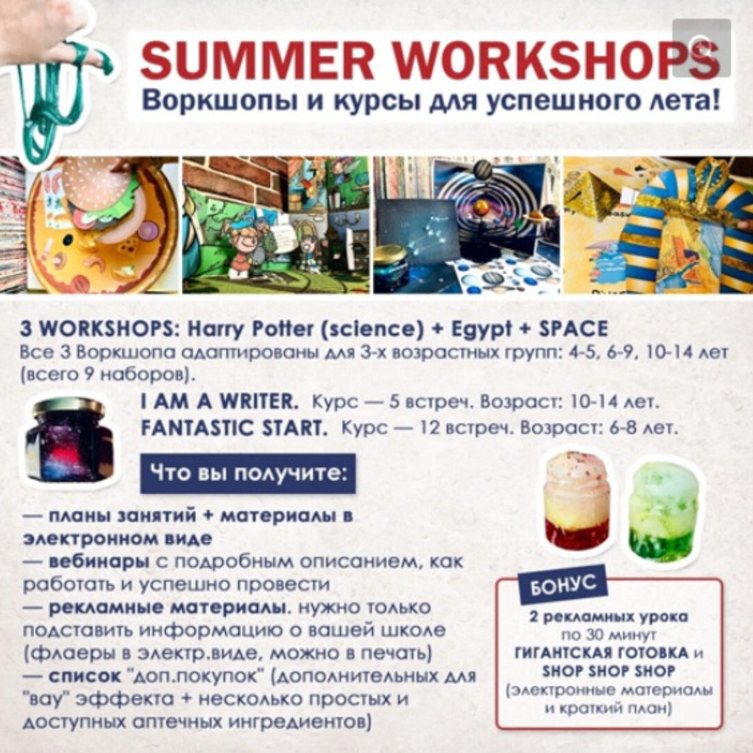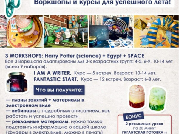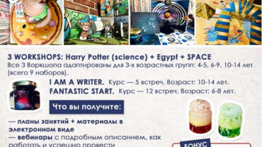 Все 3 Воркшопа адаптированы для 3х возрастных групп: 4-5 лет, 6-9 лет, 10-14 (всего 9 )