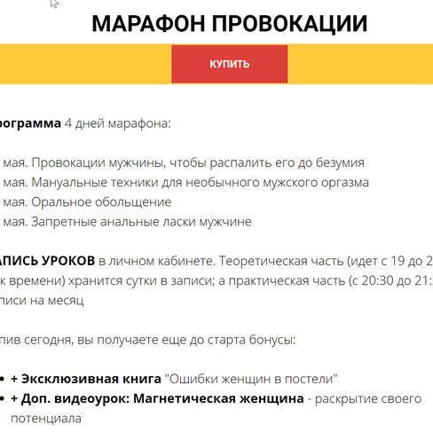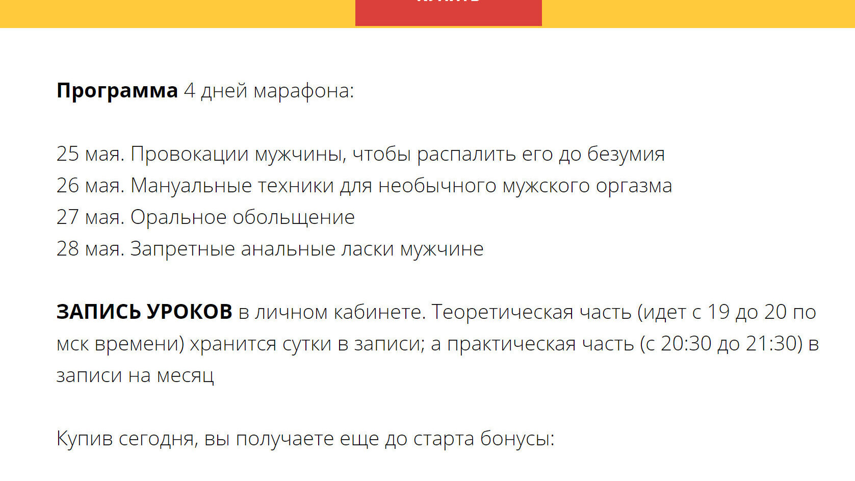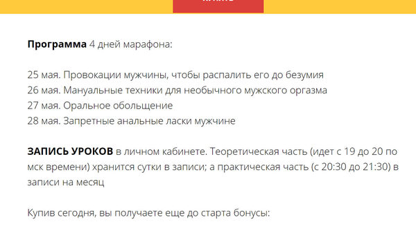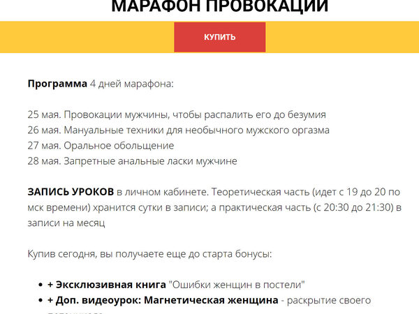День 1 «Как стать лучшей любовницей в его жизни» · Что ожидать от статусных мужчин, которых мы так желаем? Истории VIP-клиенток. · Мужская психология. Почему молчат мужчины или предпочитают ответ «Всё хорошо, дорогая, ты себе придумываешь». Почему мужчина не говорит правду. · Что действительно