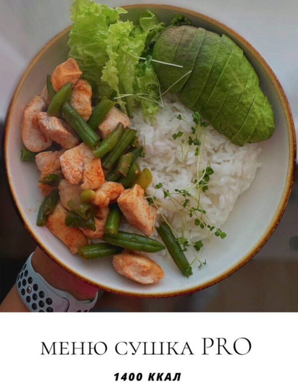 Курс Profitme - Меню сушка Pro. 1400 ккал, автор Екатерина Максименко. Основные продукты в меню: овсяные хлопья, гречка, рис, курица, индейка, красная рыба, кальмар, креветки, авокадо, оливковое масло, овощи, хлебцы, протеин