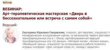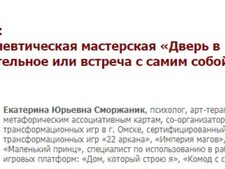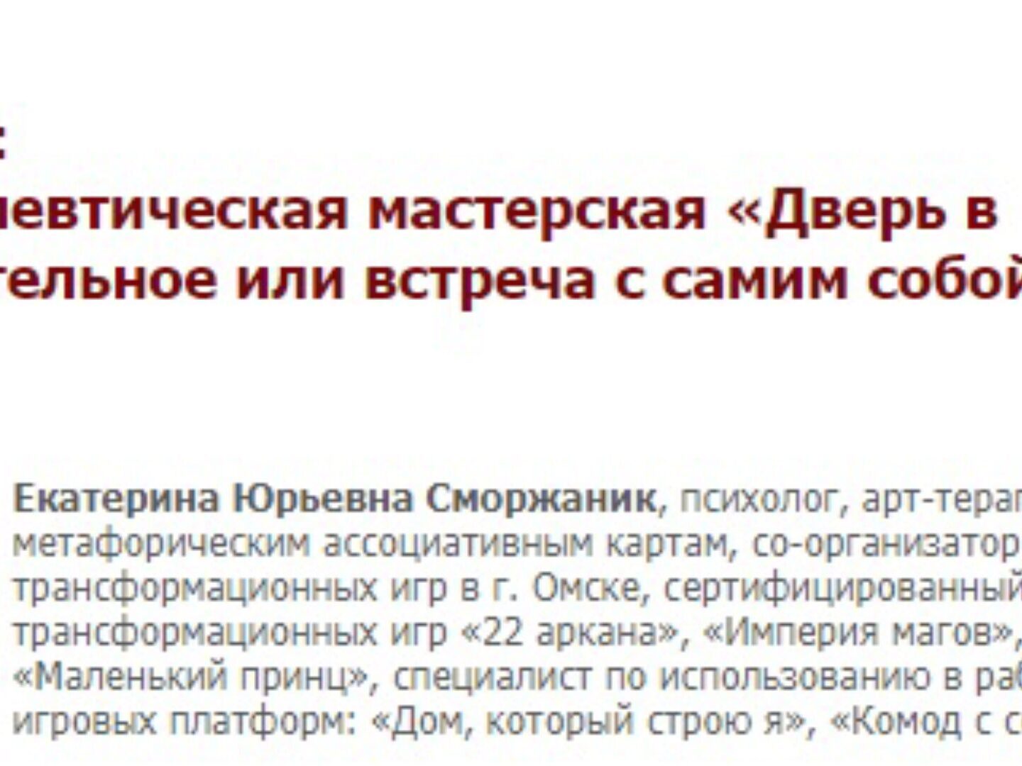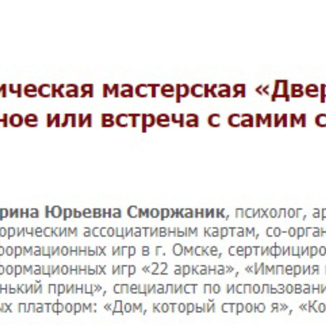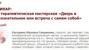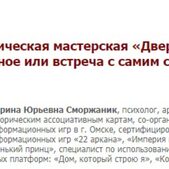 Екатерина Юрьевна Сморжаник, психолог, арт-терапевт, специалист по метафорическим ассоциативным картам, со-организатор первого фестиваля трансформационных игр в г. Омске, сертифицированный ведущий трансформационных игр «22 аркана», «Империя магов», «Колесо жизни», «Маленький принц», специалист по использованию в работе психолога игровых платформ: «Дом, который строю я», «Комод с секретом».